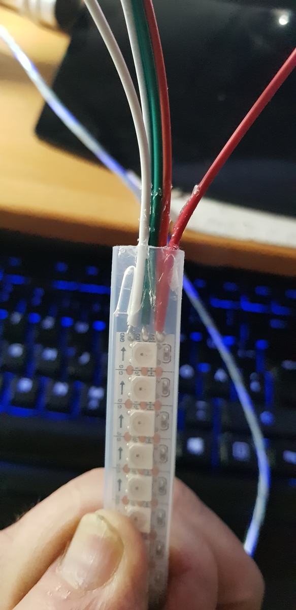 Ich habe meinen Beitrag noch ein bisschen ergänzt: COM1 ist der falsche Port. Das ist ein Anschluss an deinem PC, nicht das Witty Cloud Modul. Das Witty Cloud Modul ist mit hoher Wahrscheinlichkeit das unbekannte Gerät. Unbekannt deswegen, weil du keinen Treiber installiert hast. Ja, du musst den CH340 Treiber installieren. Wie gesagt musst du auch die LED-Leiste entfernen, da sie viel mehr Strom aufnimmt, als der PC über sein USB Kabel bereit stellen kann. Lader das Programm (ohne LED-Leiste) hoch und prüfe, ob es funktioniert. An deinem WLAN Router kannst du sehen, ob es die WLAN Verbindung aufgebaut hat. An der bunten LED auf dem Witty Cloud Modul kannst du erkennen, ob die Firmware arbeitet. Dort müsste dann die bunte LED auf dem Board regelmäßig flackern, da die Farbe rot mit dem Steuersignal für die LED-leiste verbunden ist. Diese LED-Leiste hat mit gutem Grund 5 Anschlüsse. Für den Anschluss eines starken Netzteil mit 5V und mindestens 3A sind die dicken Leitungen vorgesehen: