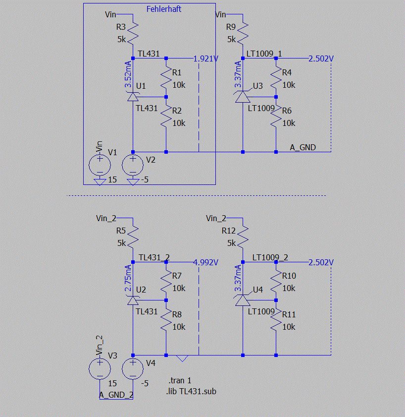 Hi, ich habe wiedermal ein Problem mit LTspice. Fehlerhaft schein das Modell des TL431 von Texas. Links oben ist der Fehler zu sehen. Beide Schaltungen sind identisch, nur mit dem Unterschied, dass GND und A_GND vertauscht sind. Ein Spannungsunterschied von lediglich -1mV zwischen Anode und GND führt zum Fehler. Grüße