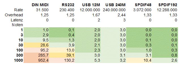 Jürgen S. schrieb: > Die Lösung wäre aber sehr einfach, wenn MIDI-Schnittstellen über normale > UARTs und deren Geschwindigkeiten gefahren werden könnten und mal > wenigstens über 230k rauskämen. Eine Nachfrage zu der Tabelle: Woher kommen der overhead und die 240MBit Bandbreite bei USB2? Das müsste doch doppelt so hoch- und somit die halbe Latenz sein? Joe F. schrieb: > Dazu kommt noch, dass zumindest das FL Studio Gerät velocity sensitive > Pads hat. Meist sind das resistive Kraftaufnehmer, die mit ADCs > abgetastet werden... Welche Abtastraten haben solche Geräte? Ich meine, wieviel Daten kommen da schon?