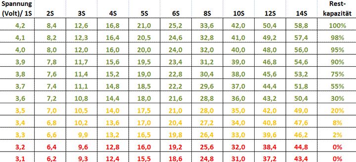 Nachtrag: Die Tabelle spricht von Leerlaufspannung, daher verschiebt sich das gegenüber dem was man gewohnt ist, wenn man Lipos im Betrieb oder beim Laden beobachtet. Mehr oder weniger je nach Belastung/Ladestrom