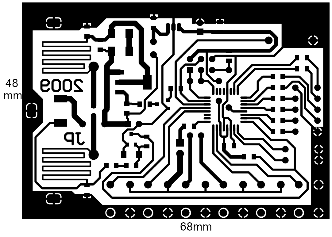 Leider sind im Original keine Maßangaben, nur ein Printfile als PDF, ich nehme an auf DIN A4: http://juras-projects.net/files/diseqcconv_board.pdf Ich bin nicht sicher, ob der Drucker das 1:1 gedruckt hat, es sind hier jedenfalls 48*68 mm. Daraus folgt eine Länge eines Mäanderstücks von etwa 10 mm.