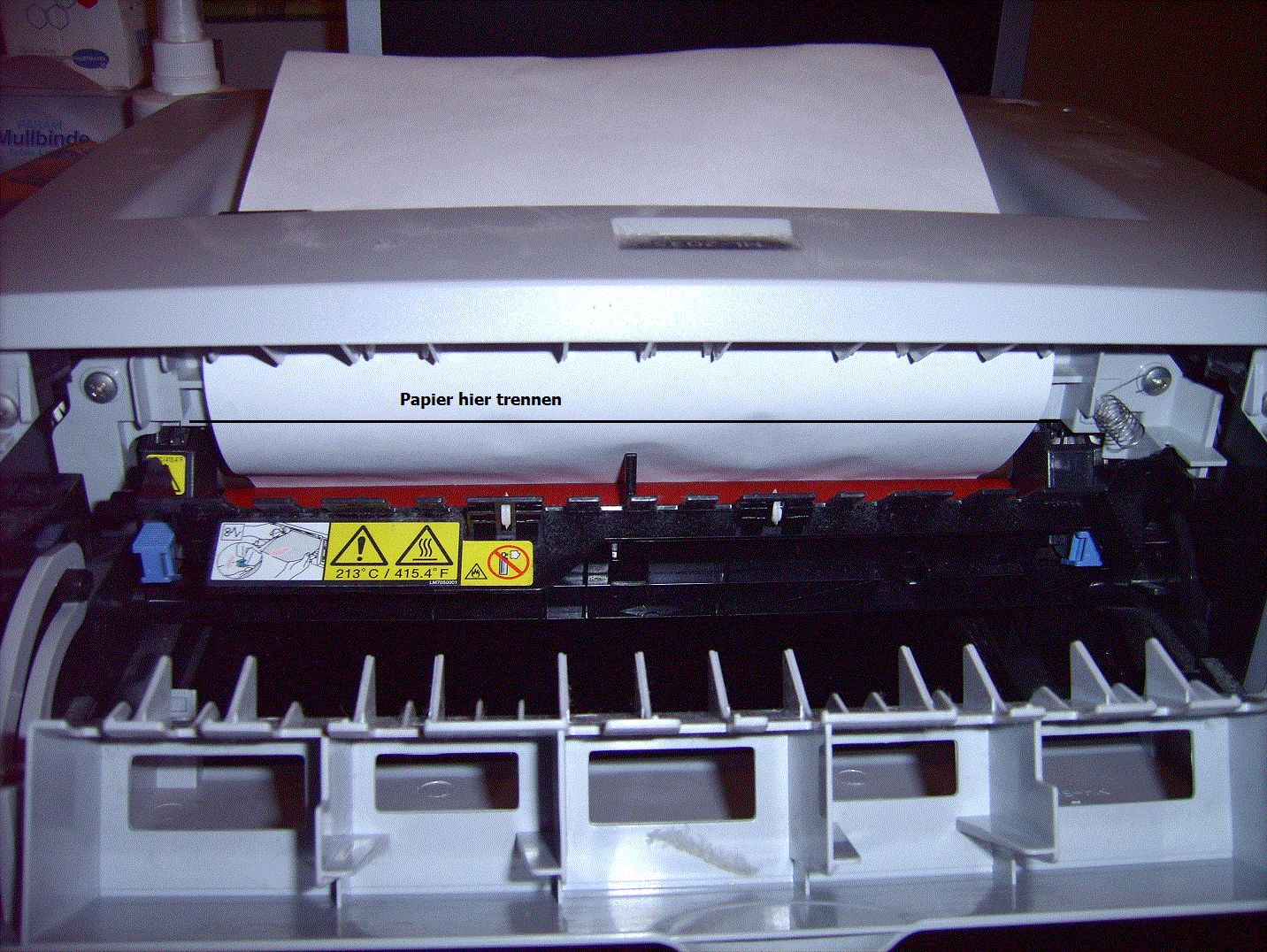 Wegstaben V. schrieb: > du kannst vorsichtig "im Gerät" das Papier an der Oberkante (da, wo das > Papier wieder aus dem Gerät heraus läuft) mit einer Rasierklinge > durchtrennen. Hallo Wegstaben V., große Klasse. Hier mein Text, der zu spät kam: Hallo, der Papierstau ist beseitigt und der Drucker funktioniert wieder. Einfach die verklemmte Seite an der markierten Stelle trennen (LPIC0915+1.gif). MfG