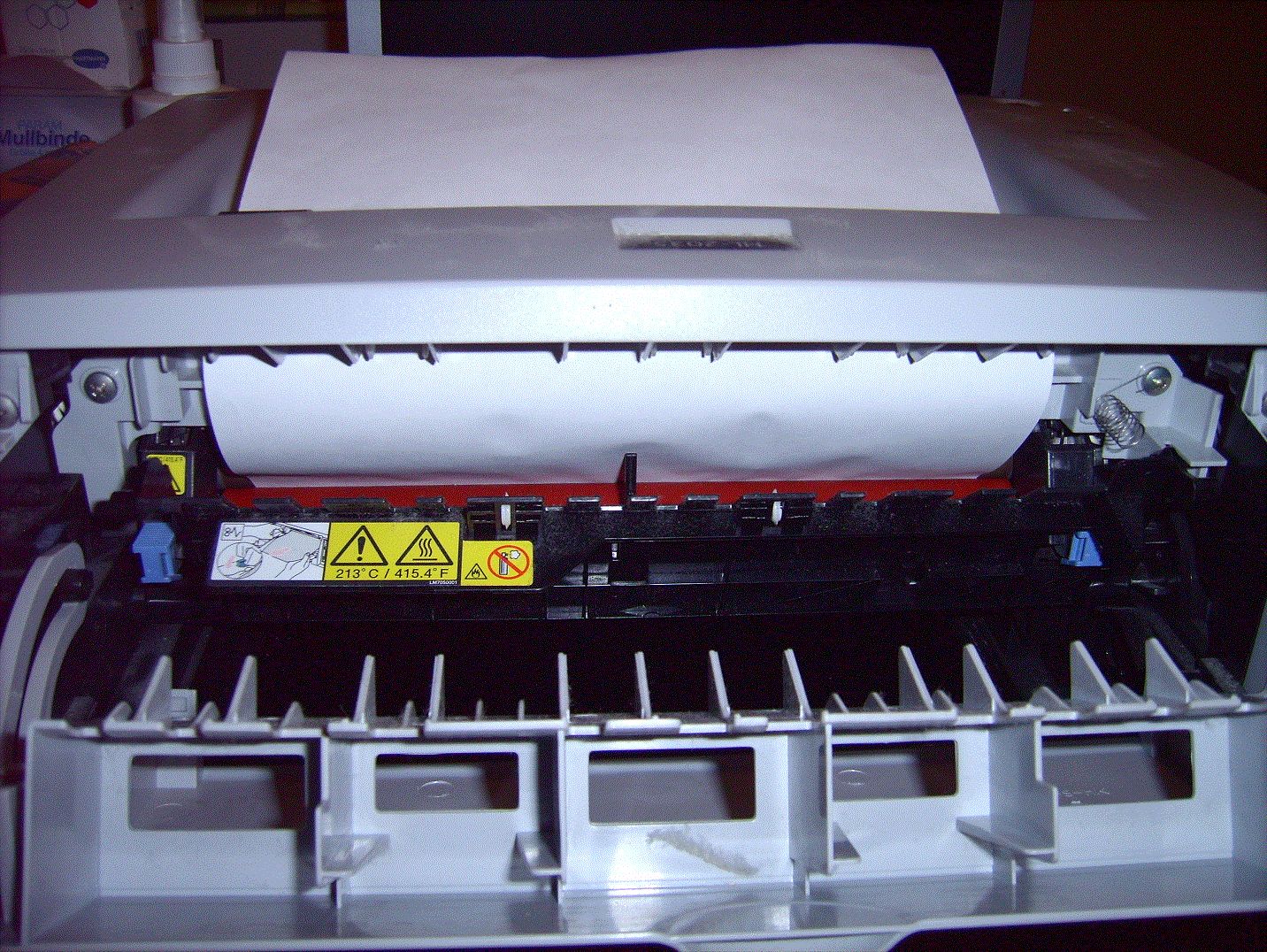 Hallo, beim Drucken der Testseite, hörte mein Brother HL-2035 Laser-Drucker nicht mehr auf zu drucken, so dass ich den Drucker mit dem Netzschalter ausschaltete. Nun gibt es einen Papierstau, siehe Foto, der im HL-2035 Manual nicht beschrieben wird. Die beiden blauen Hebel, rechts und links in Bild LPIC0915.gif, lösen die Papierwalze nicht. Wer kann helfen? MfG