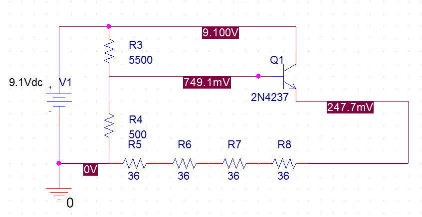 Dankeschön! Ich habe die Schaltung durchsimuliert und angepasst. Das heißt, ich will jetzt konkret 6V-Glühbirnen leuchten lassen. Siehe Fotos 6V, 2 W -> 333 mA 1.) Finden wir dafür einen Transistor? 2.) R3 ist genauso gewählt, dass, wenn R4 (der LDR) Licht sieht und nur 500Ω bietet, der Transistor gerade so nicht durchschaltet. R3 muss möglichst klein sein, damit R3 : R4 nachts immer groß bleibt und möglichst viel Spannung an der Basis herrscht. 3.) Der LDR bietet, wenn er kein Licht sieht, 2MΩ. Dadurch kriegt die Basis des Transistors 6,4V und die Lasten R5 bis R8 sind so gewählt, dass sich hinterm Emitter knapp 6V aufbauen (sind Glühbirnen, R5 bis R8). 4.) Ich musste aufgrund der hohen Widerstände und weil ich am Ende 6V haben will die Spannungsquelle etwas erhöhen. Finden wir einen Transistor, der 9V verträgt? So habe ich das vor. Hat jemand Verbesserungen? Ich baue gerne nochmal um. Noch ist alles nur Simu
