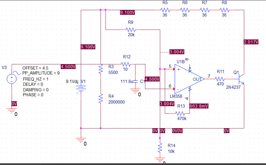 Hi, danke für die Tipps. Habe die Schaltung umgebaut. Allerdings liegt der Strom über R8 im pA-Bereich. Was muss ich an den Parametern, die zum LM358 gehören, verändern? Edit: V3 dient nur, um zu testen, ob der Komparator funktioniert.