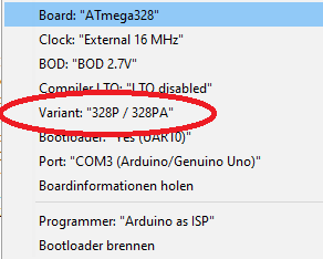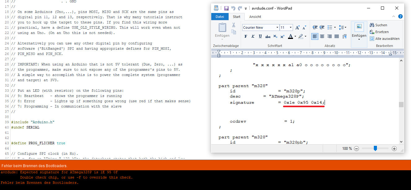 Ich kann den Bootlader nicht brennen, weil ich aus Unwissenheit ATmega328 und nicht 328P gekauft habe. Nun habe ich dort eine Anleitung gefunden und die Signatur geändert. http://www.crash-bang.com/resource/bootload-atmega328/ Auch nach Neustart des Rechners erwartet Arduino die 0F am Ende. Was muss man da noch machen? VG Kalle