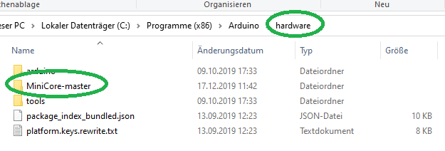 Kalle schrieb: > Funktionieren tut das aber noch immer nicht, > auch bei MiniCore gibt es den 328 ohne P nicht. Bei mir schon! Weil: In der boards.txt stehts drin. Siehe: https://github.com/MCUdude/MiniCore/blob/master/avr/boards.txt Alternativ: Du kannst in dem Ordner eine boards.local.txt neben die originale boards.txt legen und da drin deine eigenen Definitionen unterbringen. Oder die originalen verändern.