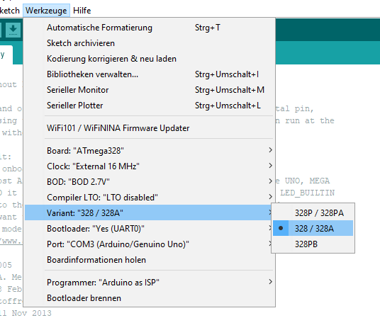 Oder Du bindest eine andere "Auswahl" in der IDE ein: https://github.com/MCUdude/MiniCore Das mache ich auch mit allen anderen AtMega die Arduino so nicht kennt. Du musst dann aber auch den Bootloader entsprechend den MC bei Minicore auswählen.