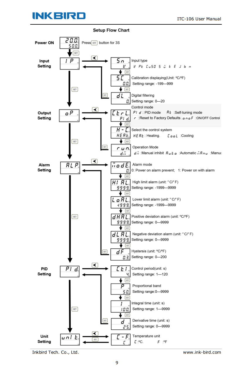 Guten Morgen, hat jemand zufällig Erfahrungen mit dem ITC106VH von Inkbird oder vergleichbaren Reglern und könnte mir bei den Parametern etwas unter die Arme greifen? Aufbau: Inkbird ITC106VH mit SSR an dem zwei Heizspiralen á ~1200Watt hängen, als Temperaturfühler wurde ein PT100 gewählt. Das ganze soll einen alten Backofen steuern bei dem der alte Drehregler defekt ist. Ziel: Ein einstellbarer Temperaturbereich von 100-300°C mit +/-5°C wären schön. Problem: Der Backofen wird aktuell nicht wärmer als 40°C. Die LED am SSR leuchtet. Aktuelle Parameter: IP - Sn = pt (für den PT100) - SC = 0 (Aktuelle Messwerte sind gleich mit einem zweit Thermometer) - dL = 0 oP - Ctrl = Pid - H-C = Heat - run = dn ALP (Standartwerte keine Änderung) - Mode = 0 - HiAL = 9999 - LoAL = 9999 - dHAL = 9999 - dLAL = 9999 - dF 0,3 PID - Cfi = 4 - P = 50 - i = 100 - d = 25 (Hier habe ich auch schon andere Werte getestet aber es passiert nicht wirklich etwas) UNIT - C-F = C Vielen Dank schon einmal für eure Mühe. PS: Im Anhang das Setupmenü des Reglers.