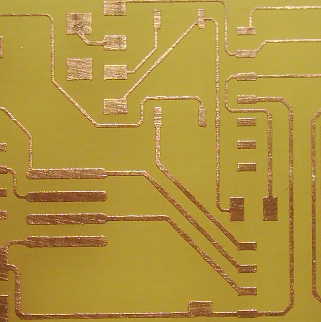 Schaut schon halbwegs brauchbar aus, Ich hätt da alerdings noch grosse Kupferflächen verteilt, sonst ist dein Natriumpersulfat nach drei Platinen schon alle. Die restlichen Papierfasern kann man unter Wasser mit dem Daumen wegrubbeln, hält der Toner normalerweise problemlos aus. (Könnt ja mal jemand ausrechnen, ob Toner oder Ätzmittel billiger ist) /Ernst