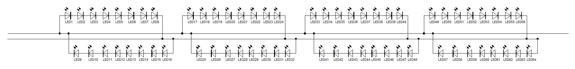 Hallo. Durch die Internetsuche bin ich auf euer Forum aufmerksam geworden, und habe folgende Problemstellung: Meine neue Lichterkette hat ein Netzteil mit mehreren Blink-Funktionen die leider nicht gespeichert werden beim ausschalten. Ich würde gern ein eigenes Netzteil bauen und verwenden. Die Richtlinien für den Umgang mit 230V sind mir bekannt. Die Licherkette hat lauter "antiparallel" geschaltete LEDs, natürlich immer mehrere in Reihe, lege ich eine Gleichspannung an leuchtet jede zweite, beim umpolen dann jeweils die anderen LEDs. Eine Skizze der Lichterkette habe ich angehängt. Mit 50Hz Sinus habe ichs schon versucht, aber das flackert zu stark. Mein Funktionsgenerator macht leider auch nur 20Vss Das Originale Netzteil gibt ein sauberes Rechteck mit gemessenen 30V und 250Hz aus, und sowas würde ich gern selbst bauen, viel Leistung ist nicht nötig. Auf dem Oszi ist die Rechteck-Spannung 6cm hoch bei 10V/cm, am RMS Multimeter sind es 30V im Wechselspannungsbereich. Wie könnte man so eine Spannung einfach erzeugen. Die Frequenz muss nicht genau sein. Eine PA Endstufe und einen Funktionsgenerator wollte ich ungern unter den Weihnachtsbaum legen.