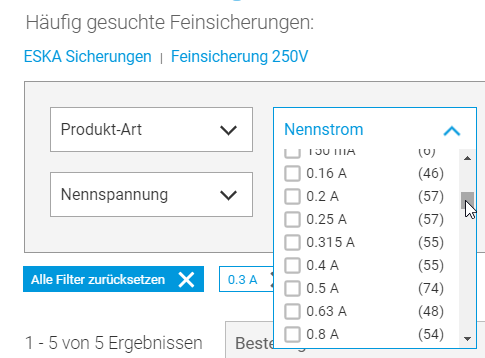 Bei Sicherung klingt mir der Wunsch nach einem vollständigen Sortiment als ziemlich mühseliges Unterfangen. Bei mir werden Sicherungen auch in deutlich geringeren Stückzahlen als Widerstände verbraucht. Eigentlich nur als Einzelstücke. Also reichen zwei, drei Werte pro Zehnerpotenz und Standardbauform vorrätig zu haben. Ist eine kaputt, wird der nächstgrößere Wert für den vorläufigen Weiterbetrieb eingesetzt und zeitnah der genau passende Wert bestellt. Aber wie gesagt: Vielleicht liegt das ja auch an mir, daß mir so selten eine Sicherung durchbrennt, daß mir der Unterschied zwischen 27 Cent und 38 Cent für den Stückpreis völlig egal ist.