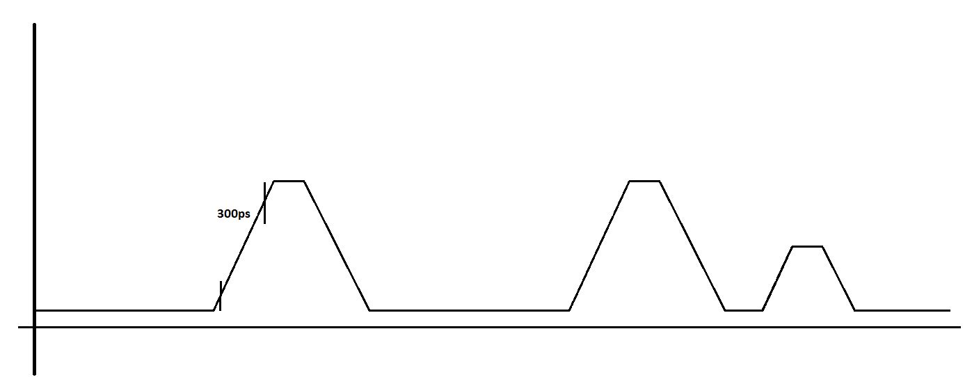 Als Referenz dachte ich an einen zwei kanaligen DDS Baustein der zwei Frequenzen (Rechteck) ausgibt z.B. 5000 Hz und 5000,01 Hz. Der durch die unterschiedlichen Frequenzen wird der eine Trigger "durchlaufen". Ich möchte nicht die Anstiegszeit von 300ps ausmessen. Das Bild zeigt im linken Teil einen Impuls ohne Antwort und im linken Teil einen mit Antwort. Dieses möchte ich absampeln und an einen PC übertragen. Der Impuls ist mindestens 1 ns breit, deshalb dachte ich das ein Messpunkt reicht.