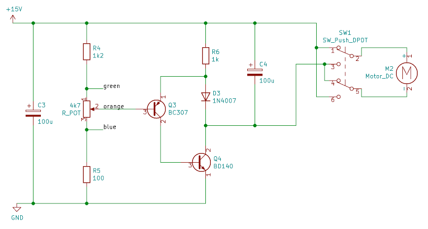Hallo, ich komme nicht weiter und brauche Hilfe. Für den Umbau eines Schmalfilmbetrachters (reines Hobby-Projekt) möchte ich mich mit einem uC in die bestehende Motorsteuerung hängen. Die bestehende Motorregelung habe ich im Anhang aufgezeichnet, offenbar ein "Sziklai-Paar"? (Kannte ich noch nicht, sieht aber so aus und funktioniert prima). Das Poti zwischen R4 und R5 liefert an der Basis von Q3 eine Spannung von ca. 0,4 bis 13,2 V und regelt den Motor von Stillstand bis Vollgas. Soweit, so gut. Nun möchte ich die Motorgeschwindigkeit aber durch den uC (nach-)regeln, ohne die bestehende Schaltung komplett zu ersetzen (Grund hierfür ist u.a., dass ein Betrieb auch ohne den uC unverändert möglich sein soll). Ich komme aber prima an die Anschlüsse des Potis (kann es also auch durch PhotoMOS-Umschalter ganz auskoppeln) sowie an GND und die 15 VCC. uC ist ein AtMega 328P, der auch einen MCP4725 (DAC) neben sich hat und, da ich hier mit PWM wohl nicht weit komme, auch 12-Bittig DC zwischen 0 und 5V ausgeben kann. Meine Frage: Was sollte ich zwischen den DAC und die existierende Steuerelektronik hängen, um per uC den gesamten Regelbereich der vorhandenen Elektronik nutzen zu können? Ich habe schon mit MOSFETs zwischen Q3-Basis und dem R4/R5 Spannungsteiler experimentiert, der Regelbereich ist aber winzig, vermutlich weil ein MOSFET eben (anders als das Poti hier) nicht Spannungsteiler ist. Ich bin mit meinem Latein am Ende und erhoffe mir von hier Hilfe. Schon mal vielen Dank für jeden Denkanstoß. :)