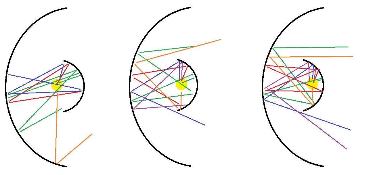Meines Erachtens ist der innere Reflektor zu weit weg von der Lampe. So dürfte das Licht nach vorne konzentiert auf einen kleinen Bereich geworfen werden. Je mehr die Lampe im Zentrum des Reflektors sitzt, desto länger hält sich das Licht innen auf. Er müsste aber so platizert sein, dass er aufweitend reflektiert. Solche Kugelanordnungen nutzt man eher, um einen gleichmäßigen Lichtstrom zu erzeugen, also Hohlkugel und einen kleinen Auslass.