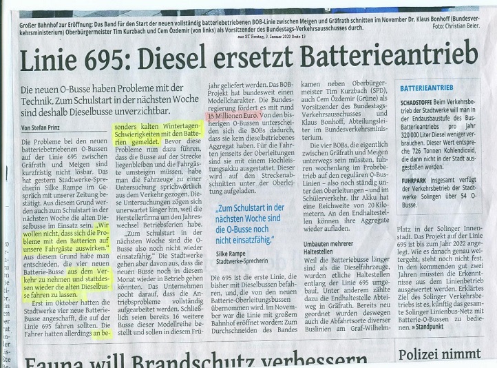 Soweit ich das weiß, Kiepe aus Düsseldorf. https://www.kiepe.knorr-bremse.com/aktuelles/pressemitteilungen/die-stadtwerke-solingen-sws-tauschen-auf-einer-ihrer-linien-dieselbusse-gegen-elektrobusse-aus-und-beauftragen-dafuer-vossloh-kiepe Und das der Bus auf der Strecke nicht vollständig laden kann, steht auch schon drin. Und das er oft genug nicht lange an der Endhaltestelle laden kann, ist doch klar. Also müssen sie die Strecke weiter elektrifizieren. Die Linie 695 bin ich noch nicht gefahren. Testbetrieb auf der Linie, ich meine 683 war das, nach Wuppertal- Vohwinkel musste er nur das kleine Stück von Vohwinkel-Schwebebahn nach Bahnhof-Vohwinkel mir Batterie fahren. Das ging wunderbar und diese Buse haben eine Klimaanlage. Das hat mich im Sommer sehr gefreut. Ich vermute mal, im Winter heizen die damit um Elektroenergie zu sparen. LG old.