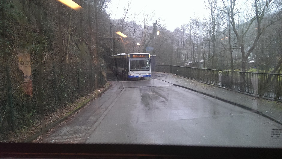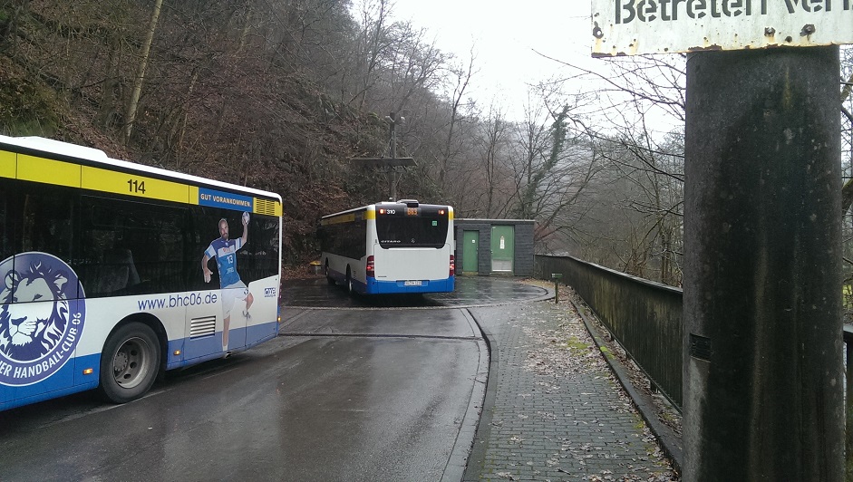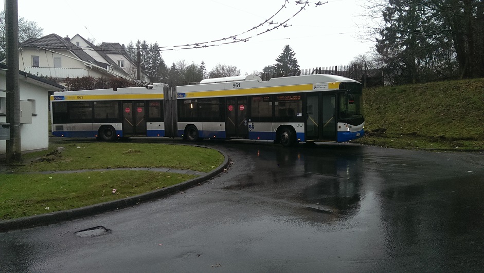 Aus der W. schrieb: > Übrigens drehen sich auf dem Drehteller in Burg > kurze Dieselbusse, weil die kurzen O-Busse abgeschafft wurden. Heute bin ich nach Burg gewandert und mit dem Bus zurück gefahren. Einstieg am Drehteller in Solingen-Burg. Es gibt einen Pendelverkehr mit dem kurzen Dieselbus zwischen Burg und der Wendeschleife Krahnenhöhe. Dort warten dann die O-Busse Richtung Wuppertal-Vohwinkel. Das ist jetzt kein Bob, sondern einer mit Verbrenner als Hilfsmotor. Den nutzt er für die oberleitungsfreie Strecke von Vohwinkel nach Bhf.-Vohwinkel. Ich bin heute nur bis zum Grafen mitgefahren und dort umgestiegen. Bilder aus Vohwinkel liefere ich bei Gelegenheit nach. Im Netz findet Ihr Bilder vom Drehteller mit historischen O-Bussen. Der Drehteller mit Pendelverkehr ist in Betrieb, weil es in Burg so eine Dauerbaustelle a la BER gibt. LG old.