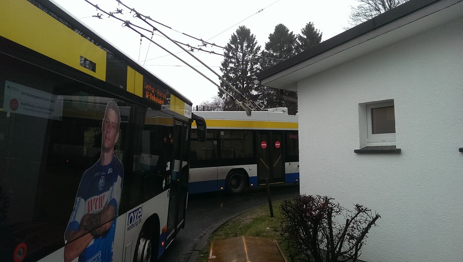 An der letzten O-Bushaltestelle sind über den Fahrdrähten Einführungshilfen angebracht. So weiße dreieckige "Dächer". Wenn der Bus korrekt drunter steht, kann der Fahrer die Stromabnehmer hochfahren lassen. Manchmal gelingt das nicht. Dass muss er/sie aussteigen und hinten mit den Seilen die Stromabnehmer händisch dran machen. Geht alles ganz fix. LG old.