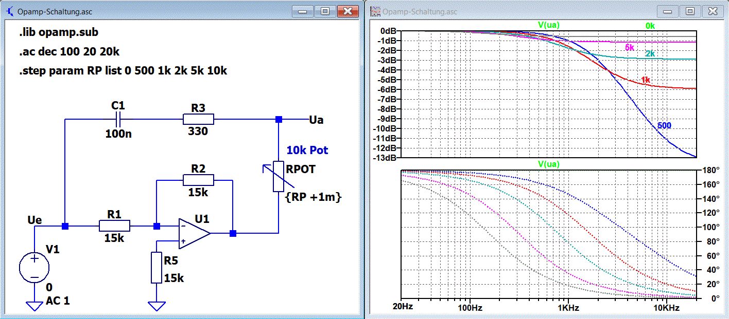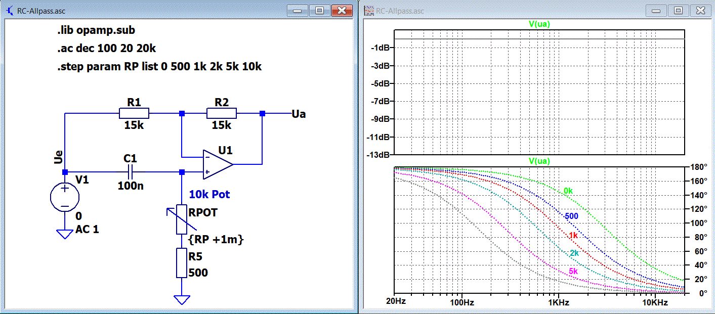 Deine Schaltung ist ein schlechter Phasenschieber da die Verstärkung bei höheren Frequenzen einbricht. Beim Allpass als Phasenschieber ist die Amplitude konstant. Allerdings ist auch da die Phasenverschiebung frequenzabhängig. Mit dem Poti verschiebt man die Frequenzgrenze der Phasenverschiebung. Im Anhang sind die Schaltungen zum simulieren mit LTspiceXVII.