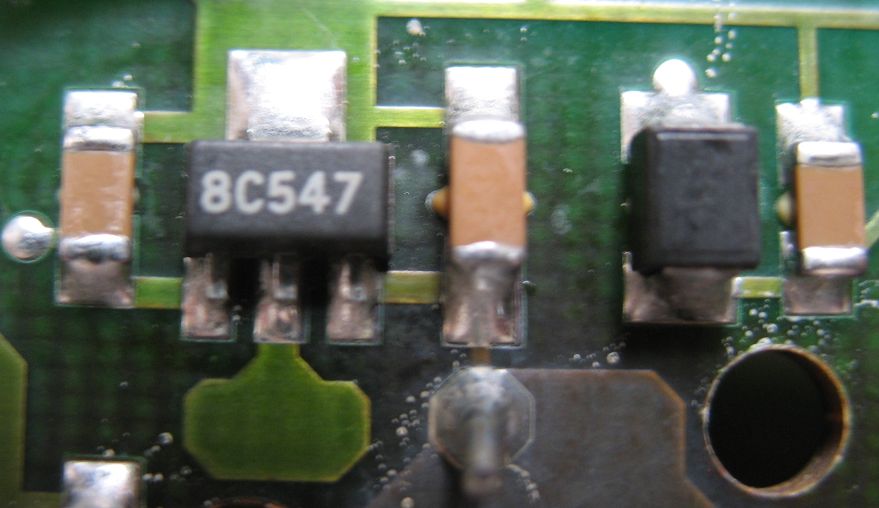 Hallo, beim Einbau einer Platine für eine Motorsteuerung fiel eine Schraube runter und verursachte einen Kurzschluss. Ja, ich weiß, dass ich den Stecker erst nach dem Zuschrauben des Gehäuses hätte einstecken sollen... Jetzt messe ich an der Versorgung des Mikrocontrollers fast einen Kurzschluss mit ca. 8 Ohm. Nun gilt es das Bauteil zu finden, das beschädigt wurde. Die Platine nimmt ca. 5W auf, die wohl hauptsächlich an einem Leistungswiderstand verbraten werden. Ein Test mit Kältespray zeigte keine eindeutigen Resultate, lediglich das Bauteile "8C547" auf dem Foto erwärmt sich recht schnell, ohne wirklich heiß zu werden. Leider kann ich das Bauteil nicht identifizieren und hoffe auf Eure Hilfe. Es liegt in dem Bereich der Platine, der für die Spannungsversorgung zuständig ist. Das schwarze Bauteil rechts davon ist evtl. eine Diode, oder? Leider sehe ich da aber weder einen Typ-Aufdruck noch eine Markierung für Anode / Kathode. Vielen Dank schon mal! Gruß Markus