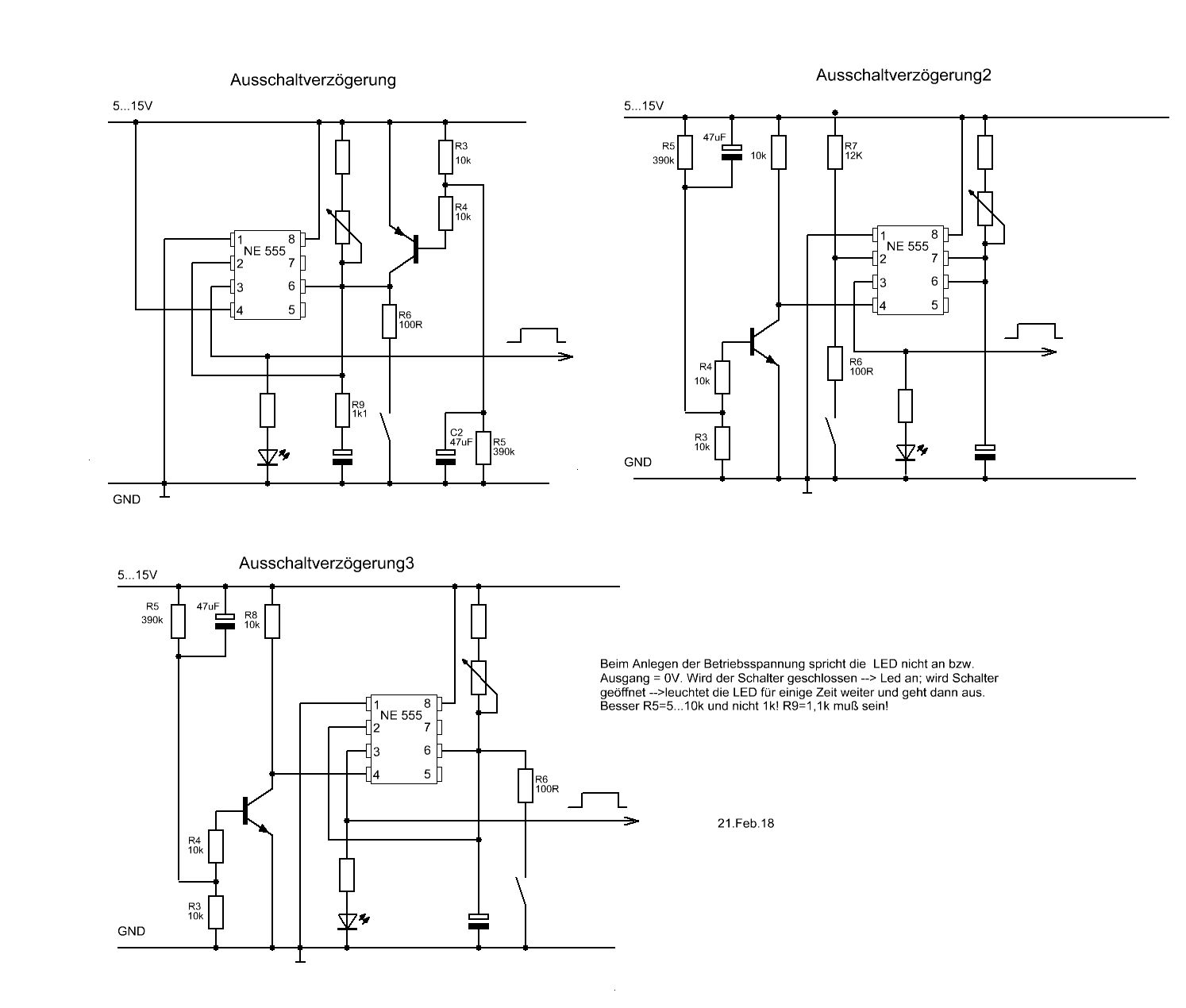mehrere Möglichkeiten Ein dual Timer 556 der erste wartet und triggert dann den 2ten Ein Resetkontroller TL7705 der wartet stabile Power ab und sein Ausgangssignal startet den Monoflop 555 Besser noch einen TLC555 nutzen der kann größere Widerstände und damit kannst du den Kondensator verkleinern, 100µF sollte zwar gehen aber für die Sicherheit vom IC sollte man auch nicht übertreiben, ich fand nach kurzem Durchsehen keine max. Werte für den DISstrom. In meiner dunkelsten Erinnerung hatte ich noch 1000µF aber da werden auch die Elko Leckströme recht groß und zerschossene Bauteile durch Elko Entladung sind mir auch nicht fremd. Ein kleiner 8 Pin µC ist auch eine Lösung