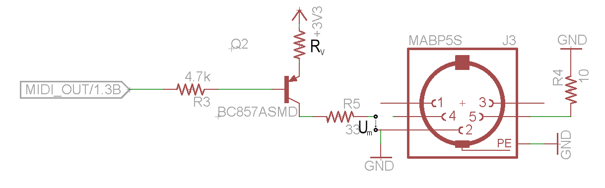 Erst mal Danke für deine schnelle Antwort. Grundsätzlich kenne ich Transistoren, ich habe allerdings bis jetzt nur mit NPN-Transistoren gearbeitet. Das erklärt ja aber die 2 folgenden Probleme nicht: - ich konnte bei eingesetztem Emitterwiderstand ein Signal am Kollektor messen (Um). - Bei bestehender Verbindung gegen Masse (LED Um gegen Masse) konnte ich kein Signal messen Ja die Problematik mit dem fehlenden Optokoppler habe ich schon gelesen. Wie häufig schätzt du/ihr das Fehlen ein? Ich möchte damit hauptsächlich Instrumente (Synthesizer und Drum Pads) synchronisieren. Kann ich eine Vorkehrung in der Schaltung gegen einen fehlenden Optokoppler vornehmen? Ah ok! Ich könnte also quasi auch einfach meine Transistor-Schaltung wie in der https://www.mikrocontroller.net/articles/MIDI Spezifikation / in dem von dir zitierten Beispiel gegen Masse verwenden? Ist das grundsätzlich stabiler als meine Schaltung mit Transistor gegen 3,3V? Dankeschön euch noch mal. Viele Grüße, Tobi