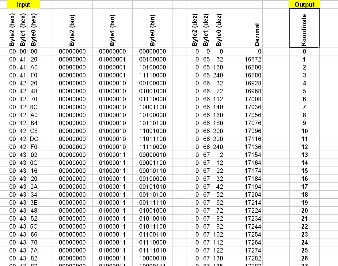Geschätztes Forum,bitte helft mir. Im Programm sPLAN wird z.B, die X-Koordinate mit 3 Bytes gespeichert. Aber wie erfolgt die Kodierung? Byte1----Byte0------angezeigte Koordinate 00000000-00000000--> 0 01000001-00100000--> 1 01000001-10100000--> 2 01000001-11110000--> 3 01000010-00100000--> 4 01000010-01001000--> 5 01000010-01110000--> 6 01000010-10001100--> 7 01000010-10100000--> 8 01000010-10110100--> 9 01000010-11001000--> 10 01000010-11011100--> 11 01000010-11110000--> 12 01000011-00000010--> 13 01000011-00001100--> 14 01000011-00010110--> 15 01000011-00100000--> 16 01000011-00101010--> 17 01000011-00110100--> 18 01000011-00111110--> 19 01000011-01001000--> 20 Hier im Beispiel habe ich Byte2 mal ausgeblendet, ist Null. Danke Bernhard
