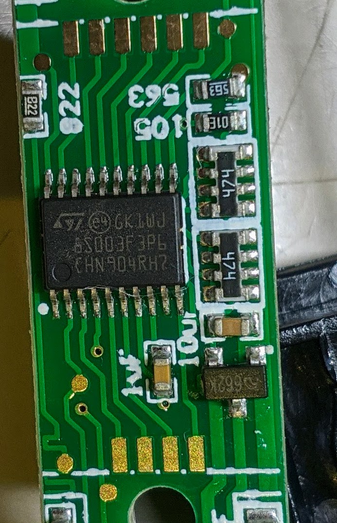 Anon Y. schrieb: > Aufschrift ist > st gk1wj > 6s003f3p6 > chn904rh7 Die wichtige Zeile ist die mit 8S003F3P6 und das ist ein STM8S003F3P6