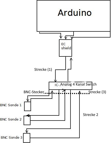 Hallo ich habe mal eine Zeichnung angehängt wenn man sich den Analagog-Switch wegdenkt so ist die Strecke zw. EC-Shield und dem BNC-Stecker wohl entscheidend. Je kürzer die Strecke umso geringer die Störanfälligkeit. Ich versuche nun einen Weg zu finden um diese Strecke möglichst gut zu schirmen. Ab dem BNC-Stecker haben die Sonden selbst eine Art Koax-Kabel. Gibt es keine Möglichkeit Leiterbahnen via Kupfer-klebefolie und dann in ein Epoxy-Bad damit es später keinen Kurzschluss gibt . Zum schluss wird ein Kupfergeflecht um alles gewickelt und mit ausreichend Masse verunden. Geht das nicht? oder ist spätestens beim Analog-Switch Ende? wäre hier ein Reed-relais besser oder wäre das auch sinnlos? Es müsste doch eine Möglichkeit geben das ganze so abzuschirmen das die paar cm und der Schalter nichts mehr ausmachen.mmmhh Ist das bei Sat-Switches anders da müssen doch auch die Abschirmungen gut sein Sorry wenn ich hier recht laienhaft die Fragen stelle