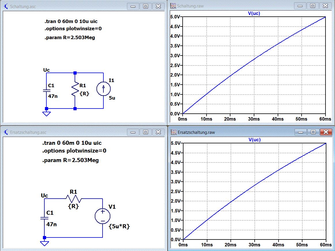 Und das ist ja einfach, hast du ja ausgerechnet mit 47ms Mit dem R wird nun aber die Stromquelle nicht mehr Ideal sein denn nun hast du einen zeitabhängigen Strom. Aber an der Ladung ändert sich ja nix, es sollen ja immer noch die 5V erreicht werden und Spannung ist nunmal Ladungstrennungsarbeit. Und wenn du weißt wieviel Ladung du bewegen musst kannst du damit ausrechne wie groß der Strom in den Kondensator sein muss nach den 60 ms. Und der Strom, der dann noch nötig ist um auf die 5u zu kommen, muss natürlich durch den Widerstand ;) Ich hoffe das hilft dir.