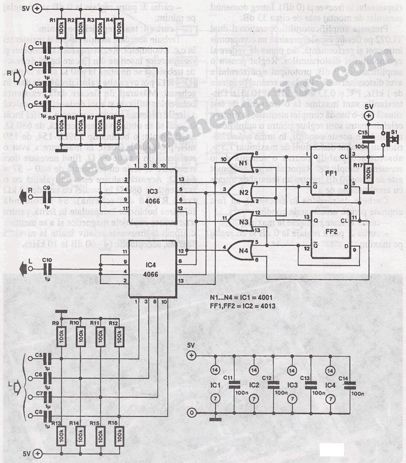 Die neue Schaltung ist auch Blödsinn, weil die Potenziale der Audio Signale auf 0V gezogen werden, der 4066 aber keine negative Versorgung an VSS bekommt. Elektor hat das damals schon richtig gemacht, als sie Ein- und Ausgänge auf Vcc/2 gezogen haben. Man muss sich auch fragen, ob ein CD4052 hier nicht sinnvoller ist. Da sind 2 4-Kanal Multiplexer schon eingebaut - es ist also nur 1 IC zum Schalten nötig. Es fällt auch der 4001 weg, weil man den Zähler direkt an die Kontrolleingänge des 4052 anschliesst.