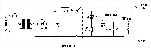 Danke für die Hinweise! So ein Thyristor-Crowbar ist funktional das, was ich wollte. Und so eine Schaltung wie angehängt (aus https://www.elektronik-kompendium.de/public/schaerer/crowbar.htm) oder auch von Udo dankenswerterweise zitiert, kriege ich auf Miniplatine ins gleiche Gehäuse ohne den Originalzustand wesentlich kaputt zu verändern. @Axel: Danke auch für den Hinweis mit der Sicherung :-)