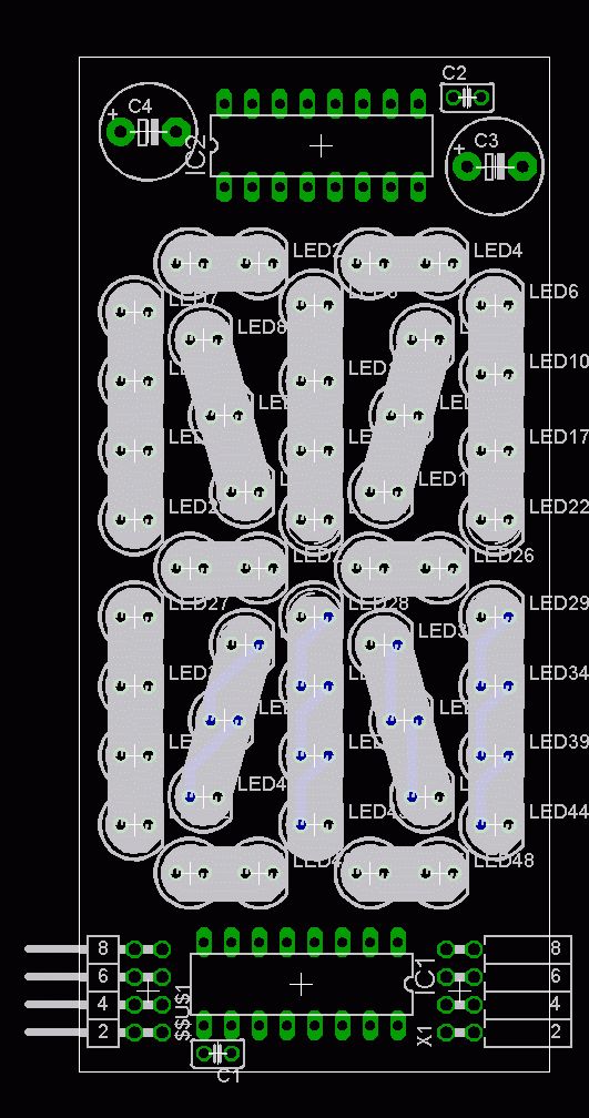 nein, eher nicht. auf dieser paltine wird ja beim bestücken entschiedenw elche lampen leuchten. Ich ahbe das so verstanden das der Gute Herr Arndt die möglichkeit haben möchte nach dem aufbau der platine die einzelnen segmente nach freien belieben anzusteuern. In meiner ausbildung haben wir mal solche segmente gebaut, jedes hatte eine serielle schnittstelle, beliebig viele konnteman sozusagen in reihe der schnittstelle schalten und es wurde dementsprechend alles angezeigt was man auf die schnittstelle geschrieben hat. Wenn man ein Modul hate war nur ein zeichen darstellbar, wenn man 12 stück hintereinander in die schnittstellenleitung gebracht hat wurden halt 12 zeichen angezeigt usw. war auf jeder platine nen Pic oder AVR drauf.