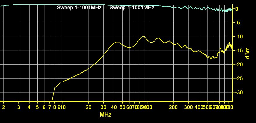 >Bei welchen Impedanzen, insbesondere am "empfangenden" Draht, hast Du >das gemessen? Beidseitig 50Ohm Abschluss. Noch realistischer wäre es natürlich gewesen einen OpAmp oder CMOS Ein/Ausgangsituation nachzustellen, war halt nur ein Schnellschuss. Hier noch ein Bild ohne 50Ohm Term. auf der Primärseite, hebt natürlich den Pegel an. Ausserdem hab ich noch kurz ausprobiert wie stark die tieferen Frequenzen angehoben werden wenn man die Kopplung durch einen Ferrite Kern verbessert (Ferrite Entstörkern für Flachbandkabel über die Schlinge geschoben).