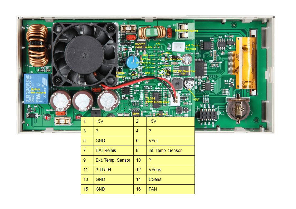Hallöchen.. Ich hab mal ein wenig die einzelnen Bauteile und Funktionen im RD6006 Controller analysiert. https://i.ibb.co/6XGcp78/RD6006-Cntrl.png Vom Mikrocontroller führt eine Steuerleitung von Pin 6 des Pfostensteckers zum PWM-Controller (TL594). Damit wird die Ausgangsspannung gesteuert. Die gleiche Steuerleitung benutze ich für die Spannungsregelung in meinem Netzteil. Für das Anzeige von Spannung und Strom gibt es zwei Sens-Leitungen an Pin 12 und Pin 14 des Pfostensteckers. Diese Leitungen führen an die ADC-Eingänge des Mikrocontrollers. Ein direktes Steuersignal vom Mikrocontroller, dass beim Überschreiten der Strombegrenzung geschaltet wird, habe ich leider nicht gefunden. Stattdessen sinkt die Spannung an der VSens-Leitung auf 0 Volt. Der Strom wird über die CSens-Leitung an Pin 14 vom Mikrocontroller überwacht. Was mir besonders in der Schaltung aufgefallen ist, das der Minus-Pol vom Netzteil-Anschluss auf der RD6006 Platine nicht wie üblich, direkt auf GND-Potential führt, sondern über einen MosFet auf GND geschaltet wird. https://i.ibb.co/mtZHtng/20200327-220310.jpg Kühlkörper und Leistungstransistor habe ich jetzt gegen stärkere Varianten ausgetausch. Ein leiser 80mm Noctua Fan sorgt für die notwendige Kühlleistung. Der Fan wird über die kleine Platine mit der Temperaturregelung im Gehäuses gesteuert. Gruß Rolf