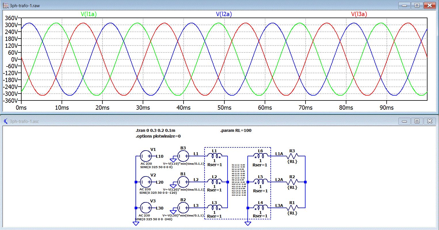 Trafoschenkel die magnetisch paralell geschaltet sind, sind elektrisch in Serie geschaltet. Du brauchst in deiner Simulation für einen Trafo mit 3 Schenkeln 9 Spulen von denen L7 bis L9 loser angekoppelt und im Dreieck geschaltet sind: Ich arbeite nicht mit spice aber die Beschreibung müßte ungefähr so rüberkommen K1 L1 L4 .9999 K2 L3 L5 .9999 K3 L3 L6 .9999 K4 L1 L7 .8 K5 L2 L8 .8 K6 L3 L9 .8 Knoten L7ende L8anfang Knoten L8ende L9anfang Knoten L9ende L7anfang