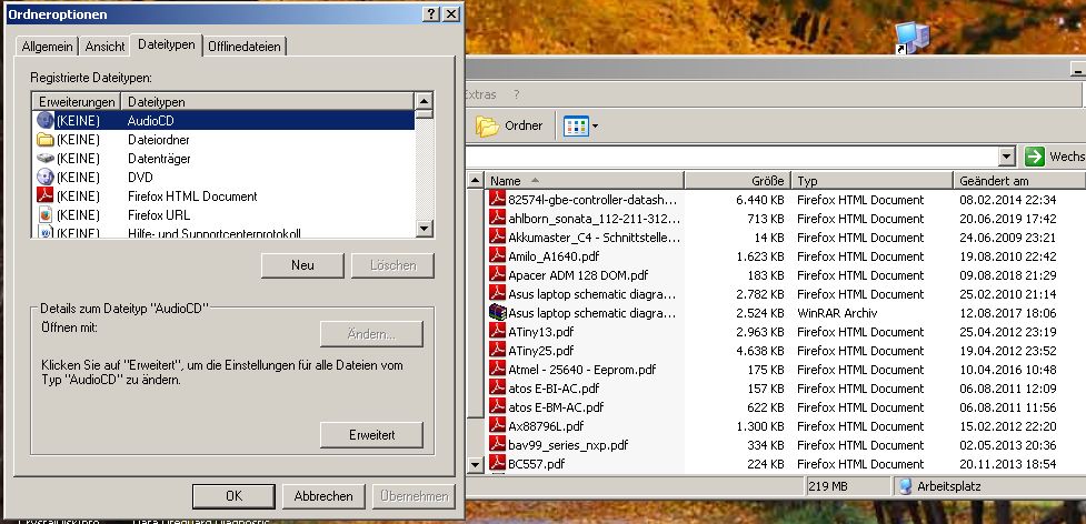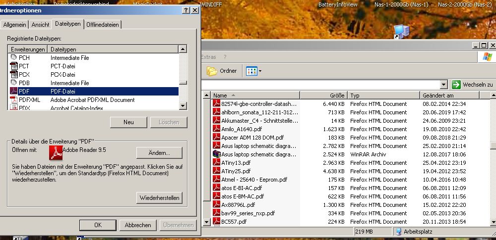 Hallo Forengemeinde, habe meinen Laptop komplett neu aufgesetzt. Es sind 3 Betriebssysteme installiert. XP, Win7 und Linux. Unter XP wurde dann der Adobereader 9.5 neu installiert. Nun wird mir im Explorer bei den PDF's vorne ein Symbol vom Mozilla gezeigt und unter Typ wird 'Firefox HTML Document' angezeigt. Geöffnet wird die Datei mit dem Adobe-Reader. Das hab ich ändern können. Wie kann ich nun den Typ ändern in 'Adobe Acrobat Document' ? So das alles wieder korrekt ist !
