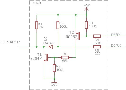 Wenn du bei der Schaltung die eigenen Echos nicht siehst, ist schon was faul. Wird TX low, soll T1 voll durchsteuern und die CCTalk Leitung auf Low ziehen. Das muss an der RX Leitung auch so auftauchen. Wenn das nicht der Fall ist, dann hast du z.B. die Diode falschrum drin oder T1 steuert nicht durch. Statisch kannst du die Schaltung mit einer LED am CCTALK messen, die gegen Plus mit einem Vorwiderstand geschaltet ist. Wird TX Low muss sie leuchten und RX muss auf low gehen. Generell würde ich R3,R4 und R6,R7 um den Faktor 10 verkleinern (also 6,8k bzw. 10k verbauen).