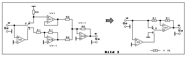 MaWin schrieb: > Single supply Vollwellenpräzisionsgleichrichter ohne Dioden, in darf > unter 0V gehen, out auf GND bezogen. > +---10k--+ > | | +5V > +--10k--+--|-\ | | MCP601 (R2R OpAmp) > | | >--+--|+\ > in --+--10k--+--|+/ | >--+-- out > | | MCP601 +--|-/ | > 10k | | | > | | +--------+ > +-|+\ | > | >--+ > GND --|-/ LMC7221 (open drain Komparator) > | > GND Irgendwie kann ich dieses nicht erkennen, ich sehe da nur einen Zeichensalat. Ich will keinen Präzisionsgleichrichter aufbauen, sondern einen Synchrongleichrichter. Die angehängte Zeichnung war falsch ausgesucht. Ich habe nur nach einem Beispiel gesucht. Ich will einfach zwischen einem nicht invertiertem und einem invertiertem Ausgang hin und her schalten. Da gibt es diese Schaltung mit einem OP, drei Widerständen und einem Schalter. Ist der Schalter offen, so ist die Schaltung ein Spannungsfolger. Ist der Schalter geschlossen, so invertiert die Schaltung. Nun suche ich nach einem geeigneten Schalter. Aber selbst ein Reedrelais würde die 50Hz wohl nicht auf Dauer mitmachen oder?