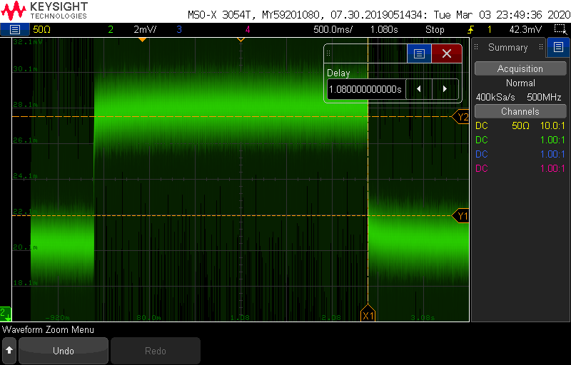 Hallo, danke Achim für die Antwort Achim S. schrieb: > Mach eine neue Messung, bei der das Oszi von Anfang an auf 1ms/Div > steht. Und mach eine neue Messung, bei der das Oszi von Anfang an auf > 50µs/Div steht. Stell den Trigger so ein, dass du in dem "flachen" > Bereich der PWM misst. die bilder hinzugefügt Achim S. schrieb: > Luke schrieb: >> Das Rauschen liegt an der Schaltung selber da ich ein RF200, OPV, Analog >> switcher in meiner Schaltung ist. > > Sorry, aber dieser Satz ergibt keinen Sinn. Zeige bitte die konkrete > Schaltung, deren Signal du misst und verrate uns, was das für ein > "thermischer Widerstand" sein soll, dess Temperaturänderung innerhalb > von weniger als 1ms abgeschlossen ist. es ist so das ich der Strom fließt bevor er in den thermischen Widerstand fließt. weil ich bei der Schaltung nichts ändern kann muss ich ein Filter einsetzen um das rauschen zu entfernen aber ich welche Grenzfrequenz nutzen soll Achim S. schrieb: > Bist du sicher, dass das zu deinem 10:1 Tastkopf passt? es ist ein Verhältnis von 1:1. Zur Messung benutze ich ein coaxialkabel 50ohm