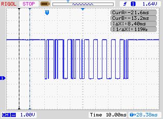 Ist das Signal regelmäßig? Ich sehe 10 mehr oder wenige äquidistante Pakete mit Hypothese "TTL seriell, Startbit = 0, dann einige Bits, dann Stopbit/Idle = 1". Poste doch bitte mal eins der Pakete in höherer Auflösung. Nein, ich gehe jetzt nicht zu L***, um ein Gerät zu kaufen.