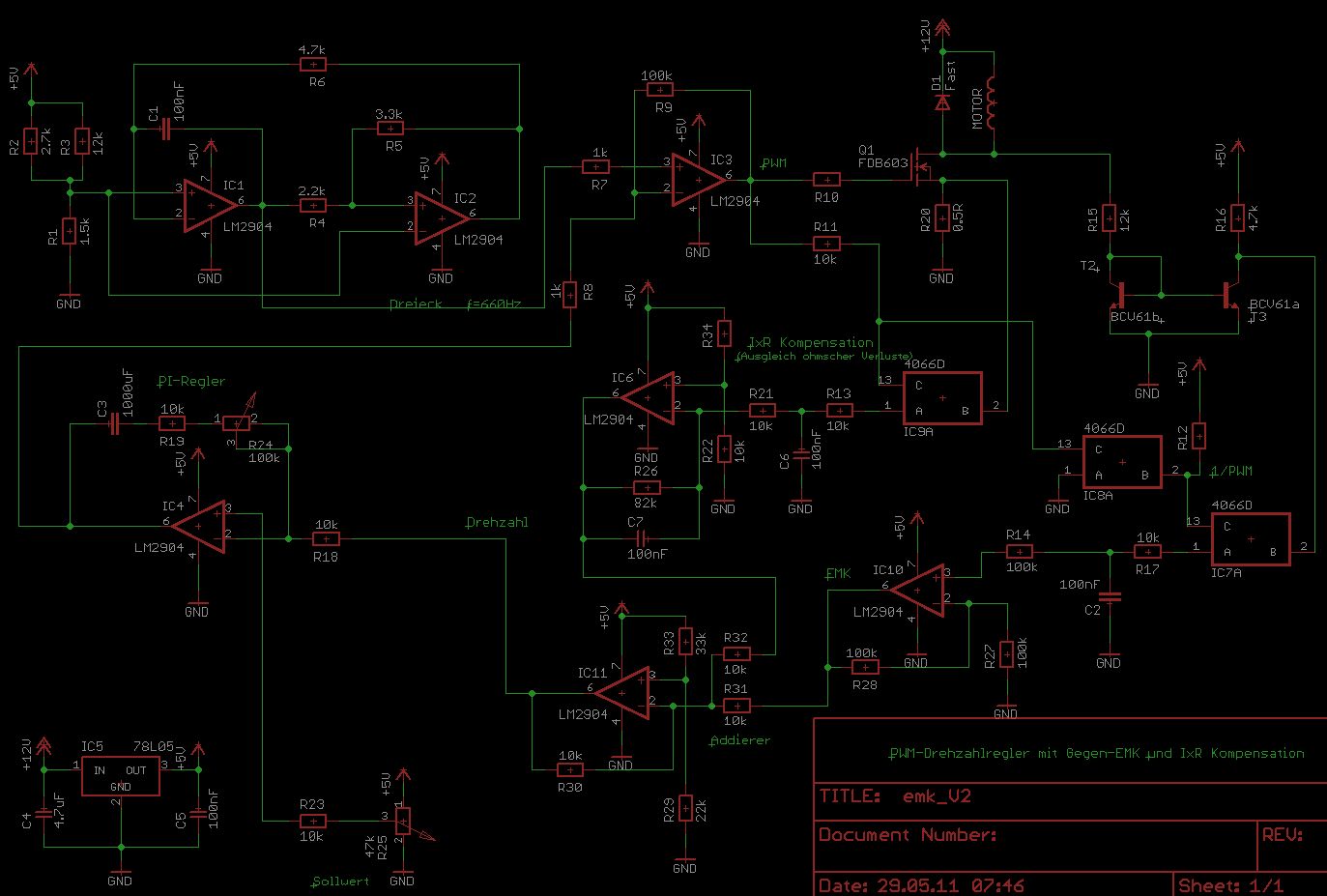 > Ganz schön umfangreich für nur 12V und 660Hz... Wieso nur? Der Motor hatte 12V und zu hohe Frequenz ist irgendwann auch bloed fuer den Motor. > Aber immerhin mal was Analoges. Ja goil was. :) Muss man ja nicht so bauen. Man kann sicherlich auch eine Menge in einen Mikrocontroller verlagern. Waere vielleicht mal eine interessante Aufgabe wenn man zu Weihnachten eingeschneit ist. > Wo liegt denn der Vorteil, sowohl IxR, als auch EMK zu regeln? Hey, das ist 10Jahre her. Liess dir selbst die Theorie an. :-) Ich glaube man bekommt sonst einen immer groesseren Drehzahlfehler mit steigender Last auf dem Motor. Wenn ich meine Schaltung schonmal selber kritisieren darf, so mit Abstand wunder ich mich etwas wieso ich da 1000uF im PI hab. Das kommt mir heftig gross vor. Vielleicht ein Tipfehler. Ich hab das damals in Baugruppen in LT-Spice entwickelt, dann auf Lochraster aufgebaut und danach den Schaltplan gemalt. Aber egal. Keiner kann diese Schaltung einfach so nachbauen und erwarten das sie mit seinem Motor funktioniert. Die wird man immer etwas anpassen muessen. Olaf