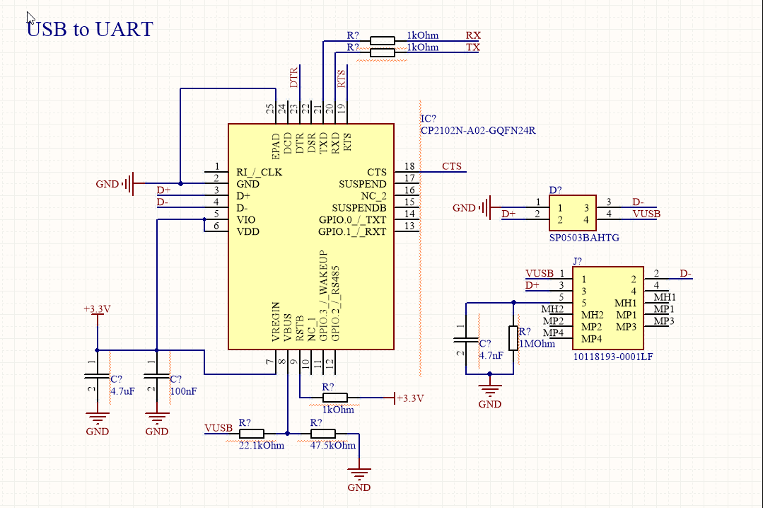 Hi, Ich möchte auf einem Board einen CP2102 USBtoUART Treiber verbauen und ich habe den 24 Pin IC hier gewählt: https://www.mouser.ch/datasheet/2/368/cp2102n-datasheet-1634912.pdf Nun verwirrt mich der VIO Pin, dieser ist nur auf den 24 Pin IC vorhanden uns was der genau macht, sehe ich nicht wirklich. Ich brauche den internen Spannungsregler nicht, da ich einen stärkeren 3.3V Regler extern habe. Im Anhang ist noch das Schema, dass ich verwenden möchte, jedoch kein VIO vorhanden. Weiter verstehe ich auch nicht, wie ich VBUS verbinden muss, wenn der IC über den externen Regler verbunden ist.