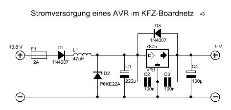 >Zum Thema Stromversorgung: würde die im Anhang aufgezeichnete Schaltung >funktionieren. Bin leider noch neu in der ganzen Materie. Ich würde lieber auf einen fertigen KFZ tauglichen Spannungsregler gehen. z.B. LM2936 Dieser Verträgt 40 bzw. in der HV Variante bis zu 60V am Eingang und gibt's auch mit verschiedenen Ausgangsspannungen. Da kann man sich die ganzen anderen Teile sparen. Batterie - Sicherung - Verpolungsschutzdiode - Spannungsregler Falls Wechselspannung, musst du natürlich noch Gleichrichten, Sieben usw. Das erkennen der Fernlichtlampe könntest du dir sogar ersparen, wenn du dich direkt an die Lampe hängst. (Wie MaWin schon gesagt hat) Lampe an -> Spannungsregler bekommt Strom -> MC sendet Befehl Das hätte auch den Vorteil, dass die Batterie bei abgestellten Motorrad nicht langsam leergesaugt wird. Das kann man zwar mit geeigneten DC-DC Wandler + AVR Standby in den Griff bekommen - Wäre jedoch viel einfacher und fehlerunanfälliger...