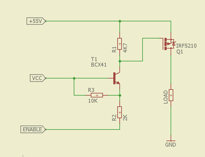 Guten Morgen alle, Ich bastel gerade an einer kleinen I/O Karte und möchte damit 55V / 10A max. schalten. Dazu verwende ich einen P-Mosfet (IRF5210). Unter anderem habe ich dafür hier im Forum eine Schaltung gefunden (Siehe Anhang). Angetrieben wird der Transistor von einem Pin eines ATmega328P. Nun verstehe ich die Auswahl der beiden Widerstände um den BCX41 noch nicht ganz: 1) Basiswiderstand 18K? Über den Spannungsteiler für den P-Mosfet fließen doch I(CE) = U/R = 55V/(18K + 4K7)= 0,0024 A = 2.4mA Wenn ich dann anhand dieses Artikels: https://www.mikrocontroller.net/articles/Basiswiderstand den Basiswiderstand ausrechne, komme ich auf: I(B) = I(CE) / hFe = 0.0024A / 30 = 0.08mA R(B) = (U - 0.7V) / I(B) = (5V - 0.7V) / 0.00008A = 53750 Ohm Also ein Basiswiderstand von 53K. Wobei der Wert für hFE geschätzt ist... (BCX41: https://www.infineon.com/dgdl/Infineon-BCX41-DS-v01_01-en.pdf?fileId=db3a30431441fb5d011449afa8490233) Wenn man jetzt den Pulldown-Widerstand von 100K mit einbezieht, dann ergibt sich aus R(B) und dem Pulldown-R ein Spannungsteiler, der die Basisspannung am Transistor noch weiter verringert. R(B) = (U - 0.7V) / I(B) = (4.2V - 0.7V) / 0.00008A = 43750 Ohm Ist der Widerstand in dem Screenshot falsch dimensioniert? Hab ich vielleicht einen Denkfehler? (Mache das zum ersten Mal ;)) 2) Pulldown 100K? Ist der nicht viel zu hoch? Wenn jemand etwas Zeit hat, sich das anzusehen, würde ich mich freuen. Vielen Dank, Guido