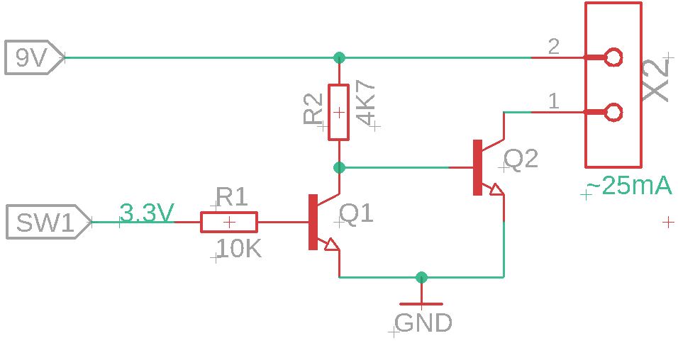 Morgen miteinander! Hoffe, ihr seid alle bei bester Gesundheit. Gleich vorweg, ich bin kein Elektrotechniker, mache das nur als Hobby! Ich will mir derzeit einen einfachen elektrischen Schalter für ein Gerät bauen. Ich würde gerne einen Arduino Pin nutzen, um eine Last mit einem Strom von maximal 25mA zu schalten. Als kleines Extra soll die Schaltung im Standardzustand die Last mit Strom versorgen. Ich habe ein Bild davon angehängt. X2 ist meine Last. Es handelt sich um ein weiteres Gerät, das zwischen einem Strom von 0.005A und 0.025A wechselt. SW1 ist der GPIO auf 3.3V level. Für eine solche Last habe ich mir gedacht, verwende ich 2 NPN Transistoren, wie etwa den NSS60201LT1G. Habe mir diesbezüglich noch weniger genaue gedanken gemacht, dieser Transistor ist zwar eventuell überdimensioniert (2A collector current, 60V Vce) aber sowas wäre mir in diesem Fall egal, solange es funktioniert. Funktionsweise wie folgt: Wenn SW1 off, dann Q1 off, heißt R2 ist pullup zu 9V, heißt Q2 ist an, dementsprechen Last geschalten. Sobald SW1 an, schaltet Q1, Basis von Q2 an Ground und daher off, kein Lasstrom. Die Basiswiderstandswerte habe ich mir nur schnell ausgerechnet, mit IB = IC/hfe = 0.025/160 RB = (3.3V - Vbe(sat)) / (3*IB) RB = 5546 Ohm Habe also einen 4K7 Widerstand verwendet. 10K bei den anderen, weil der muss ja kaum Last steuern. Bis jetzt sollte das passen, oder? Hab jetzt die ganz blöde Frage: Im Datenblatt steht bei Maximum ratings bei Emitter-Base Voltage max. 8.0V. Da hänge ich grade irgendwie. Wann spielt dieser Wert eine Rolle? Wenn Q2 bei mir schließt, dann liegt 9V an der Basis, damit Emitter-Base über 8V, oder vertue ich mich da? Vielen Dank, Max