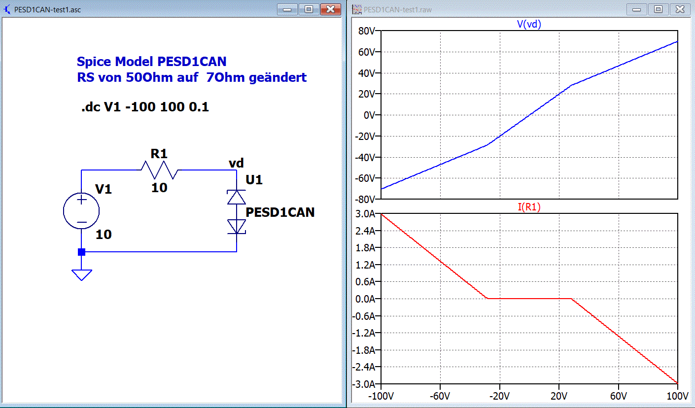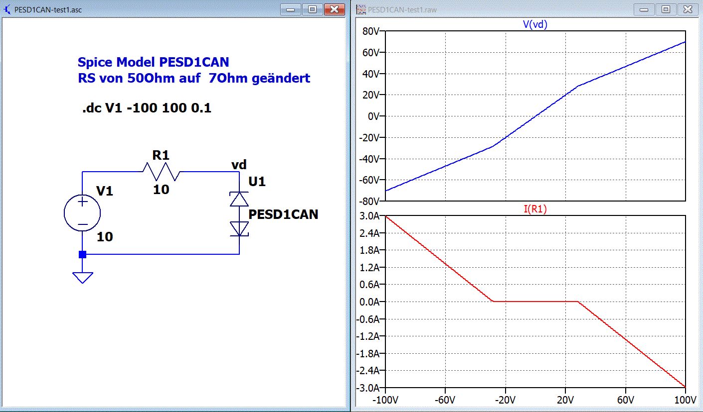 Hallo Luk, ich habe dir mal ein Beispiel gemacht. Spice Model PESD1CAN Ich habe RS von 50Ohm auf 7Ohm geändert damit die Begrenzung ähnlich wie im Datenblatt wird. Die Dateien PESD1CAN.asy und PESD1CAN.txt immer in den Ordner des Schaltplanes kopieren. Helmut