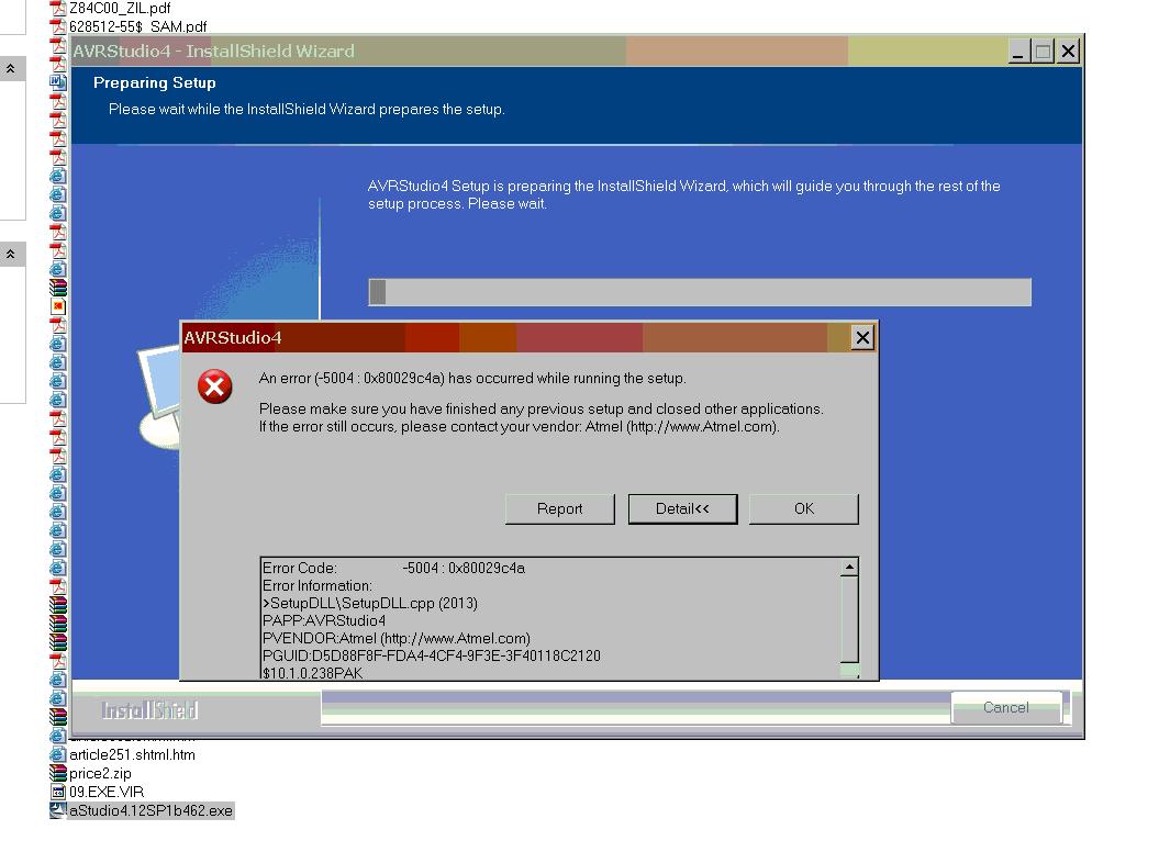 Hallo, bei mir bricht die Installation des AVR-Studios im mit folgender Meldung ab: Error Code: -5004 : 0x80029c4a Error Information: >SetupDLL\SetupDLL.cpp (2013) PAPP:AVRStudio4 PVENDOR:Atmel (http://www.Atmel.com) PGUID:D5D88F8F-FDA4-4CF4-9F3E-3F40118C2120 $10.1.0.238PAK @Windows XP Service Pack 2 (2600) IE 6.0.2900.2180 Was ist das; Wie kann man das beheben? neuer Download, Kompatibilitätsmodus, Entpacken mit rar,... ging alles nicht!