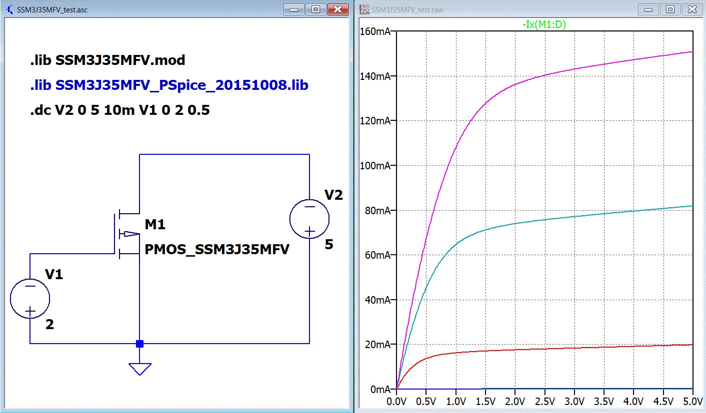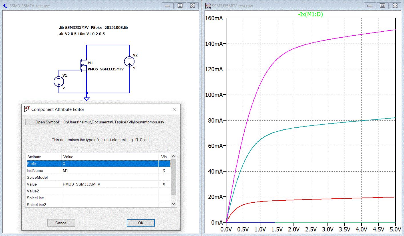 Hallo D. T., Hier mal ein fertiges Beispiel im Anhang. Anleitung --------- Platziere einen pmos CTRL-Rechtsklick auf den platzierten Mosfet In dem Dialog-Fenster Prefix:MP zu Prefix:X ändern, OK. An dem platzierten Mosfet den Wert pmos durch den Namen des subcircuits ersetzen. PMOS_SSM3J35MFV Eien SPICE-Directive hinzufügen. .lib SSM3J35MFV_PSpice_20151008.lib Fertig. Die Datei SSM3J35MFV_PSpice_20151008.lib immer in das Verzeichnis des Schaltplanes kopieren.