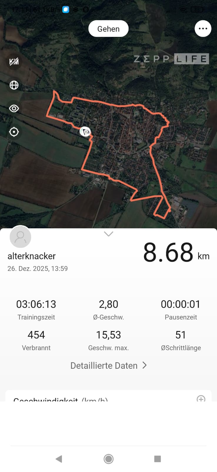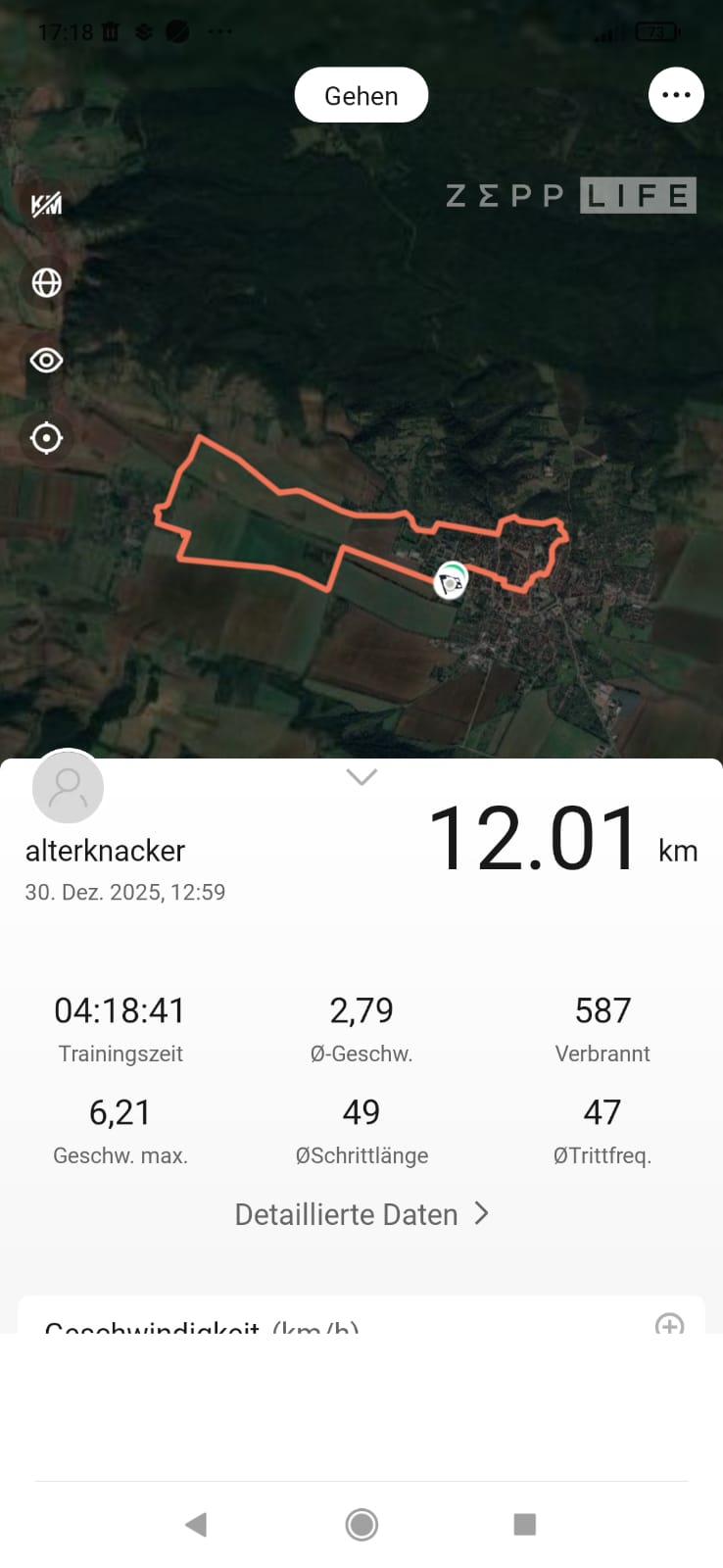 Wieder mal eine kleine Trainingsrunde. Diesmal mit dem Libre3 überwacht. Ist schon etwas positiver, muss nur noch die richtige Insulineinstellung finden. Ist Anstrengend und man muss den inneren Schweinehund immer wieder besiegen. ;--)) MfG ein alter aufmerksamer und bewegungsaktiver 80 Jähriger Knacker P.S. Muss leider immer alleine laufen, habe noch keinen gefunden der mein langsames Tempo entsprechend lange durchhält....